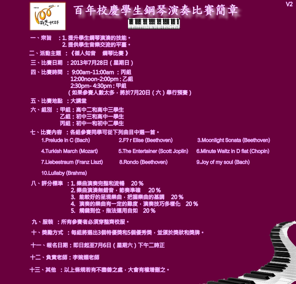 | 2.《循人知音》 2.1. 學生鋼琴比賽(詳情見簡章) 2.2. 師生、校友重唱經典舊曲及校園歌曲 2.3. 師生、校友舞臺大匯演 |