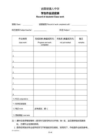班级 Class: ___________ 进度截至 Record of work completed until:_________________