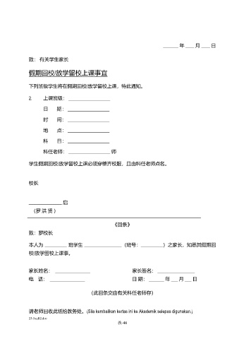 本人为 __________ 班学生 _________________(班号:__________)之家长,知悉其假期回