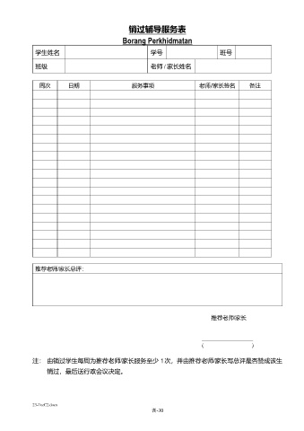 销过辅导服务表 Borang Perkhidmatan 学生姓名 学号 班号 班级 老师 / 家长姓名 周次 日期 服务事项 老师/家长签名 备注 推荐老师/家长总评: 推荐老师/家长 ____________________ ( ) 注: 由销过学生每周为推荐老师/家长服务至少 1 次,并由推荐老师/家长写总评是否赞成该生 销过,最后送行政会议决定。 23-7xzC2.docx 训-30
