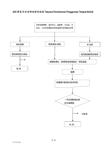 G25 课室及活动场地借用流程 Tatacara Permohonan Penggunaan Tempat Aktiviti 团体借用课室、音乐中心、音韵室、小礼堂、大 礼堂、大讲堂及其他活动场地进行活动或会议等 校外团体 联课团体/班级 补习班 须先得到校长核准 须先得到教务处核准 依据联课处“联课场地借用规定”填写表格 批 准 缴费 持表格向联课处老师申请 一天后到联课处领 回申请表格 不批准 批 准 联-38 23-24xzG.doc