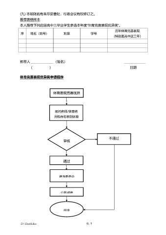 (九) 本细则若有未尽妥善处,行政会议有权修订之。 推荐表格样本 本人推荐下列应届高中三毕业学生参选本年度“体育竞赛表现优异奖”。 历年体育竞赛表现 序 姓名(班号) 班级 学号 (特别是高中这三年) 推荐人 _______________(签名) ______________ ( ) 日期 体育竞赛表现优异奖申请程序 体育表现竞赛优异 奖 顾问老师/体育老 师推荐名单到体育 处 不通过 审核 通过 遴选委员会 公布成绩 结束 23-12xzH.doc 体- 7