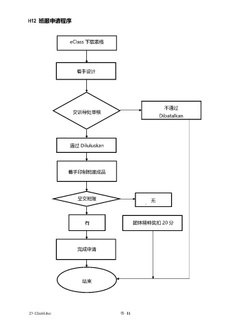H12 班服申请程序 eClass 下载表格 着手设计 不通过 交训导处审核 Dibatalkan 通过 Diluluskan 着手印制班服成品 呈交班服 无 有 团体精神奖扣 20 分 完成申请 结束 23-12xzH.doc 体- 11