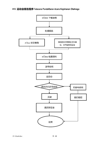H13 运动会报名程序 Tatacara Pendaftaran Acara Kejohanan Olahraga eClass 下载表格 处理报名 纸档经班导师签名交体育 eClass 呈交表格 处,交号码布保证金 eClass 检查资料 派号码布 运动会 清洗并归还号码布 有缺号码布 无缺 按价赔偿 退还保证金 结束 23-12xzH.doc 体- 12