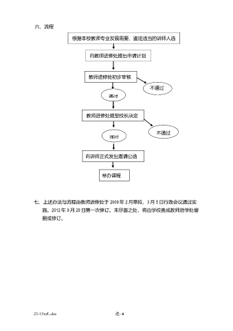 六、流程 根据本校教师专业发展需要,鉴定适当的讲师人选 向教师进修处提出申请计划 教师进修处初步审核 不通过 通过 教师进修处提呈校长决定 不通过 通过 向讲师正式发出邀请公函 举办课程 七、上述办法与流程由教师进修处于 2009 年 2 月草拟,3 月 5 日行政会议通过实 施。2012 年 9 月 29 日第一次修订。未尽善之处,将由学校责成教师进修处增 删或修订。 23-15xzL.doc 进- 4
