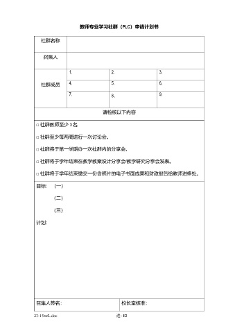 教师专业学习社群(PLC)申请计划书 社群名称 召集人 1. 2. 3. 社群成员 4. 5. 6. 7. 8. 9. 请检核以下内容 □ 社群教师至少 3 名 □ 社群至少每两周进行一次讨论会。 □ 社群将于第一学期办一次社群内的分享会。 □ 社群将于学年结束在教学教案设计分享会/教学研究分享会发表。 □ 社群将于学年结束缴交一份含照片的电子书面成果和财政报告给教师进修处。 目标: (一) (二) (三) 计划: 召集人签名: 校长室核准: 23-15xzL.doc 进- 12