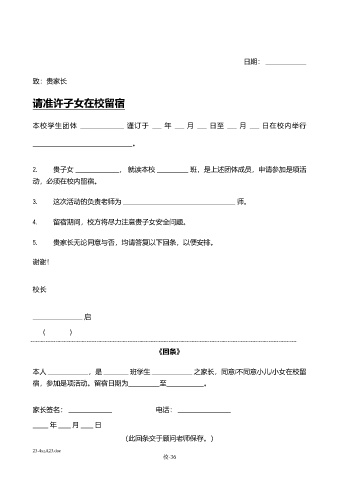 本人 _____________,是 ________ 班学生 _____________ 之家长,同意/不同意小儿/小女在校留